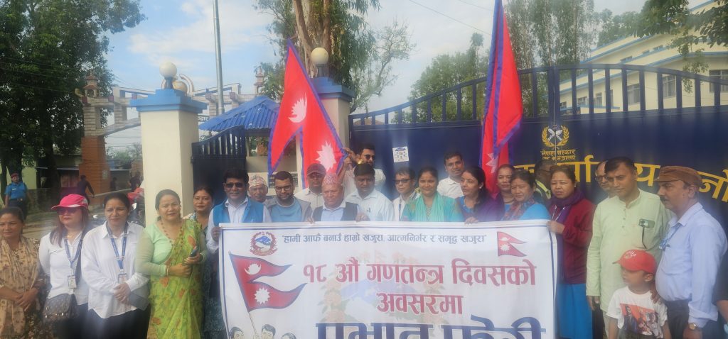 खजुरा गाउँपालिकाको आयोजनामा आज बिहान १८ औं गणतन्त्र दिवसको अवसरमा इलाका प्रहरी कार्यालय धनौली देखि खजुरा बहुउद्देश्यीय सभाहल सम्म बाजागाजा…