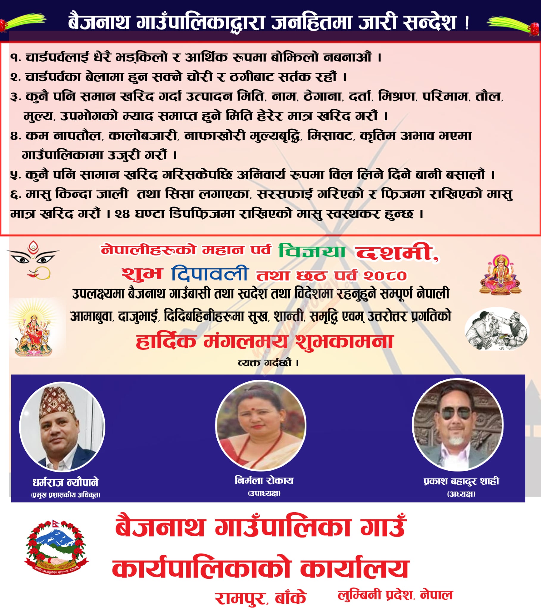 Uncategorized बैजनाथ गाउँपालिका द्धारा जनहितमा जारी सन्देश तथा दशैँ तिहार लगायतका पर्वको शुभकामना root Oct 14, 2025 0 पूरा पढ्नुहोस्