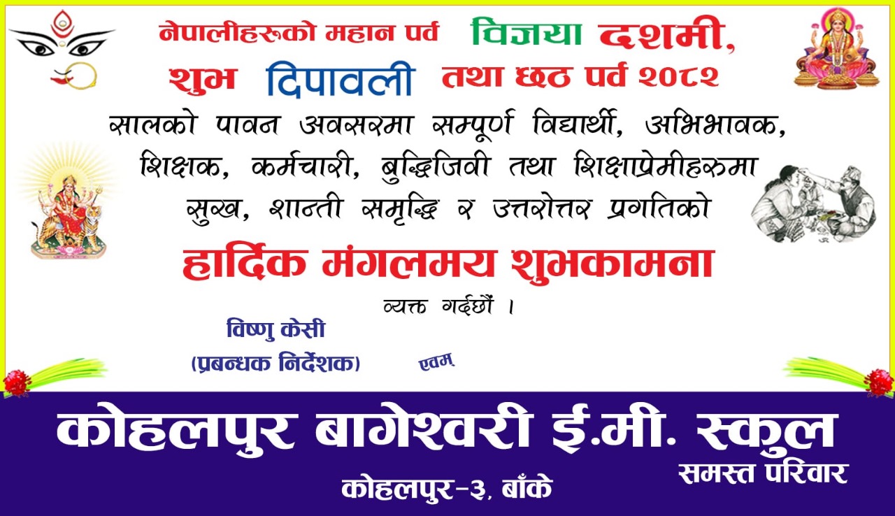 Uncategorized कोहलपुर बागेश्वरी ई.मि.स्कुल कोहलपुरको दशैँ तिहार लगायतका पर्वको शुभकामना root Oct 14, 2025 0 पूरा पढ्नुहोस्