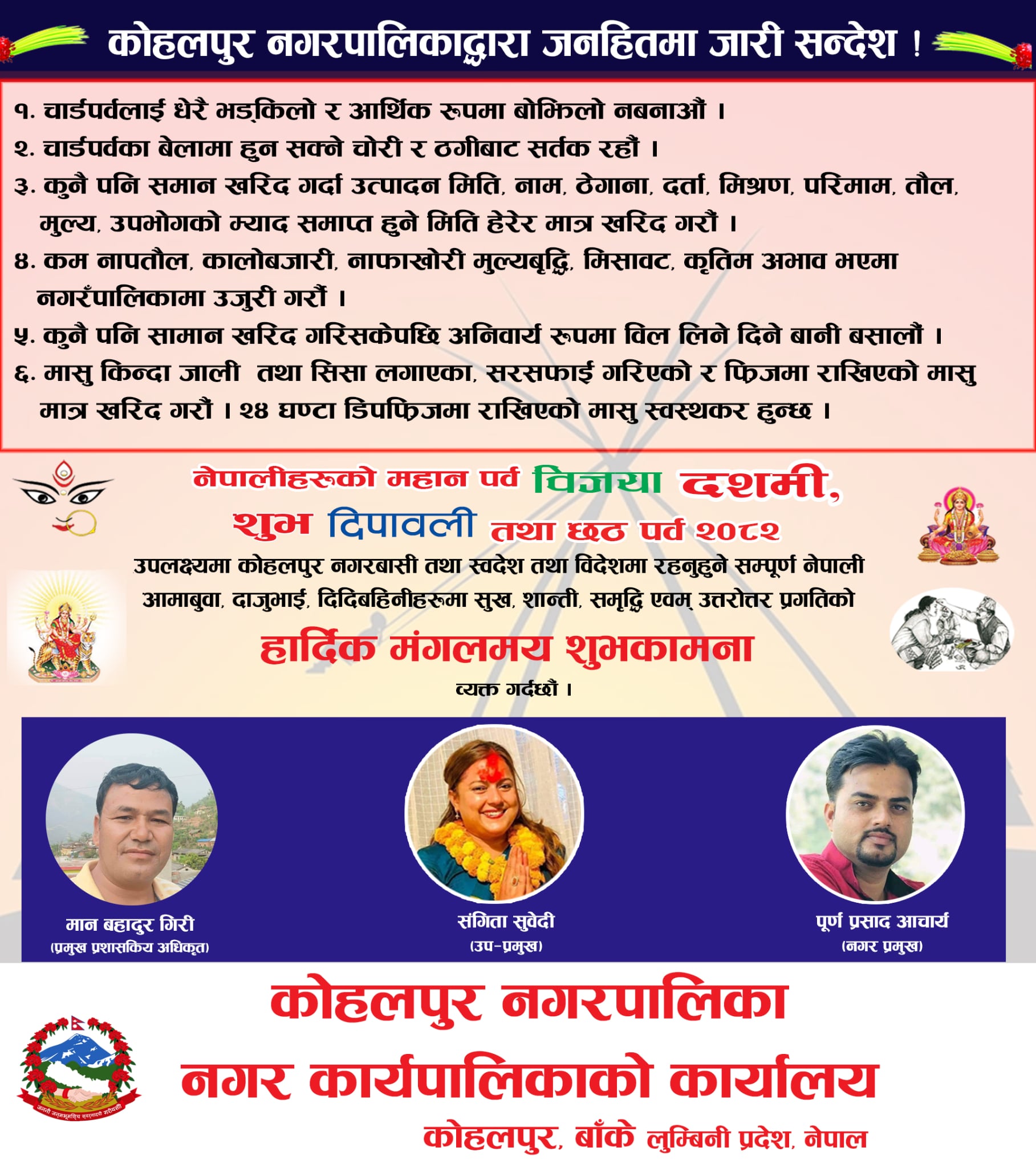 Uncategorized कोहलपुर नगरपालिका द्धारा जनहितमा जारी सन्देश तथा दशैँ तिहार लगायतका पर्वको शुभकामना root Oct 14, 2025 0 पूरा पढ्नुहोस्