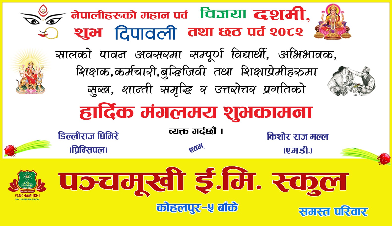 Uncategorized पञ्चमुखी ई.मि. स्कुल कोहलपुरको दशैँ तिहार लगायतका पर्वको शुभकामना root Oct 14, 2025 0 पूरा पढ्नुहोस्