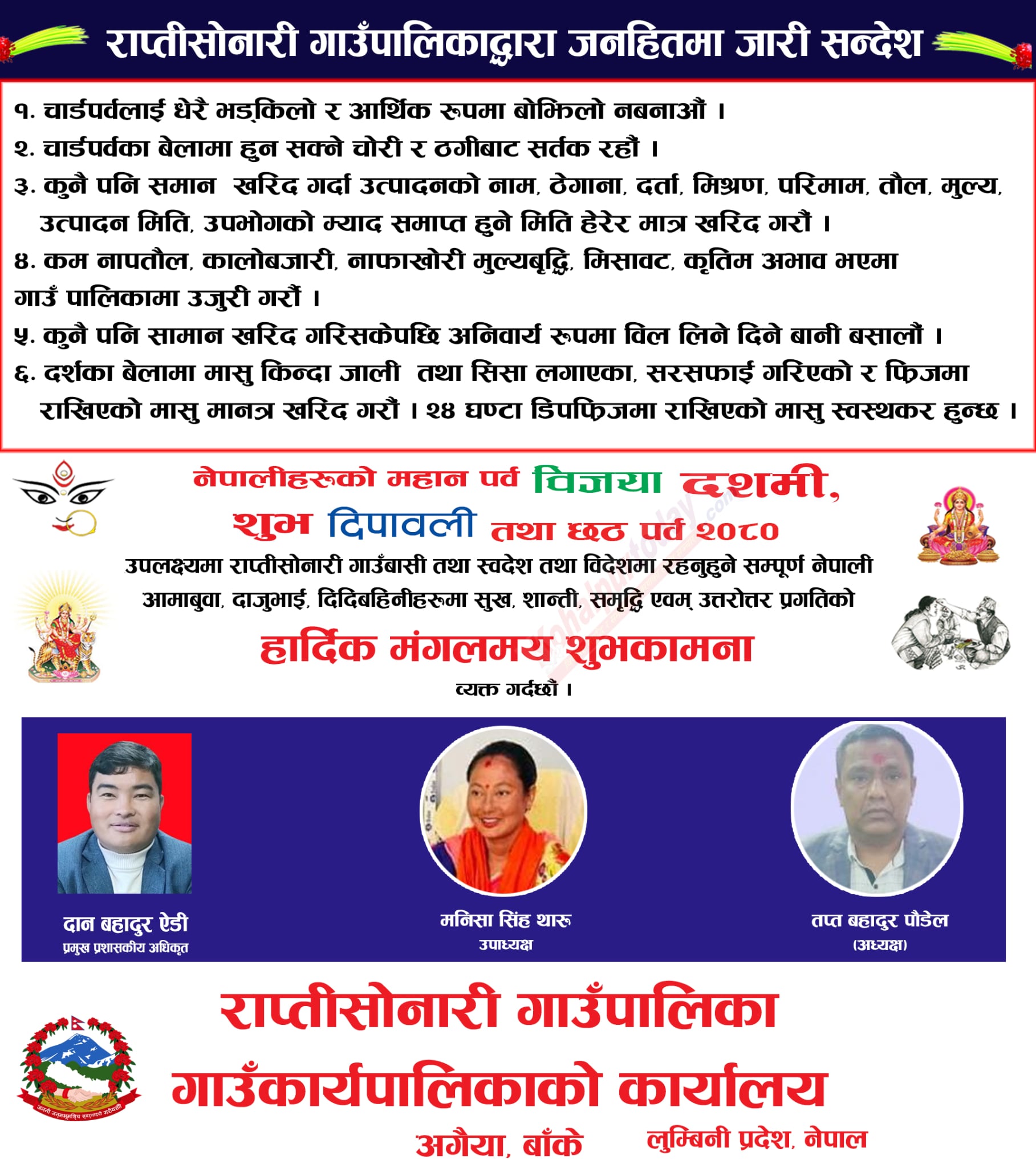 Uncategorized राप्ती सोनारी गाँउपालिका द्धारा जनहितमा जारी सन्देश तथा दशैँ तिहार लगायतका पर्वको शुभकामना root Oct 14, 2025 0 पूरा पढ्नुहोस्
