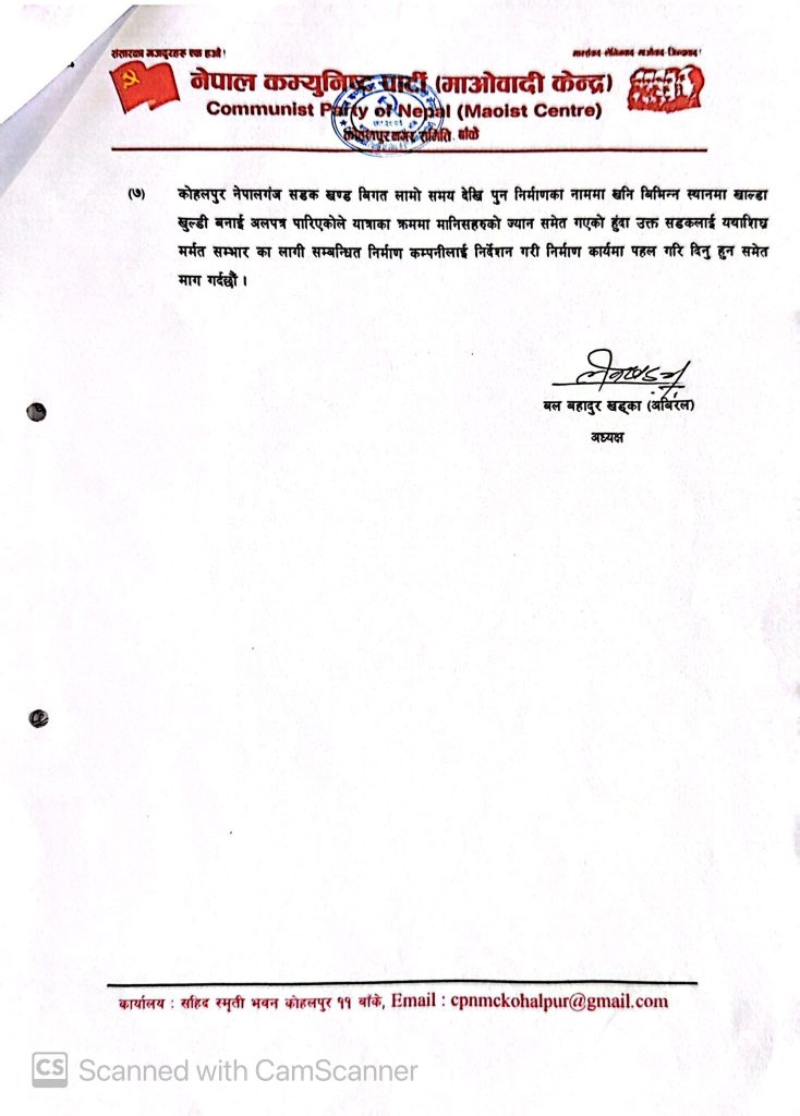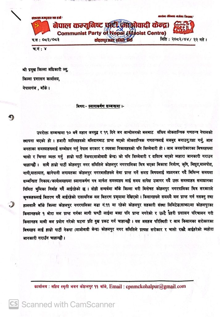 माओवादी केन्द्र कोहलपुरका अध्यक्ष बल बहादुर खड्काले बिहीवार नै प्रमुख जिल्ला अधिकारी जोशी लाई ७ बुँदे ध्यानाकर्षण पत्र बुझाएको छ ।