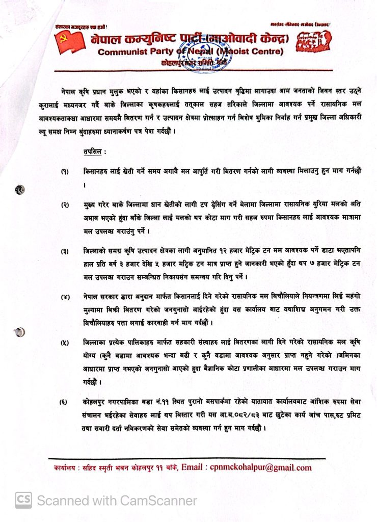 मुख्यबाली धानको सिजनमा देखिएको रासायनिक मलको समस्या समाधान गर्न नेकपा (माओवादी केन्द्र)ले माग गरेको छ । माओवादी केन्द्र कोहलपुरले बिहीवार बाँकेका प्रमुख जिल्ला अधिकारी धर्मराज जोशी लाई भेट गरि किसान लाई सहज तरिकाले मल उपलब्ध गराउन माग गरेको हो ।
