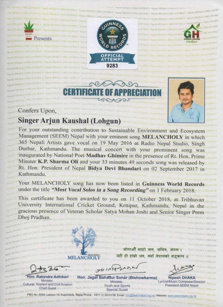 उनले सयौँ गीतमा आवाज दिइसकेका छन् । उनको मुख्य विधा लोक पप भएपनि अन्य लय र भाकाको गीत गाउन तथा सङ्गीत भर्न समेत उत्तिकै माहिर छन् । यतिमात्रै होइन, एकल आवाजमा सबैभन्दा बढी गीत रेकर्ड गरेको भन्दै सन २०१८ फेब्रुअरीमा अर्जुनले ‘गिनिज वल्ड रेकर्ड’ कायम गरेरका छन् ।