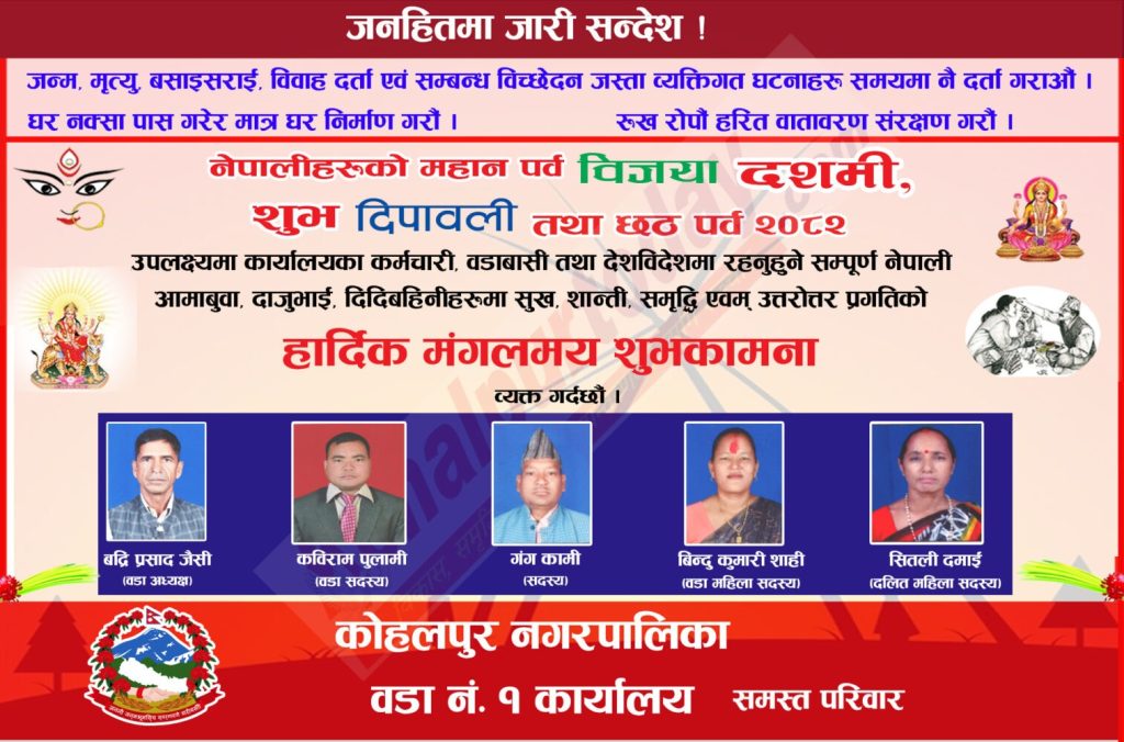 Uncategorized कोहलपुर नगरपालिका वडा न १ द्धारा जनहितमा जारी सन्देश तथा दशैँ तिहार लगायतका पर्वको शुभकामना root Nov 2, 2025 0