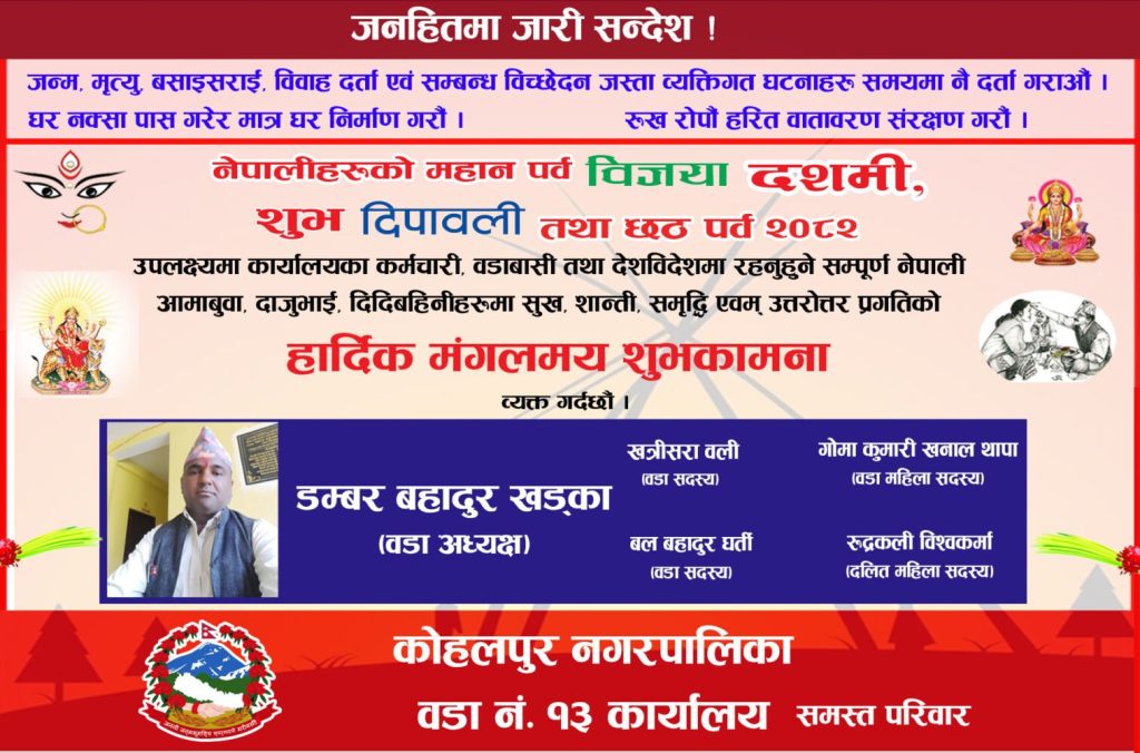 Uncategorized कोहलपुर नगरपालिका वडा न १३ द्धारा जनहितमा जारी सन्देश तथा दशैँ तिहार लगायतका पर्वको शुभकामना root Nov 2, 2025 0