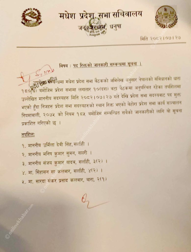 ‘संविधानमा मधेश प्रदेश सभा बैठकको अभिलेख अनुसार नेपालको संविधानको धारा १८० यो बमोजिम प्रदेश सभामा लगातार १० ९दश० वटा बैठकमा अनुपस्थित रहेका तपशिलमा उल्लेखित माननीय सदस्यहरू मिति २०८२।०७।२७ गते देखि प्रदेश सभा सदस्यबाट पद मुक्त भएको हुँदा निजहरू प्रदेश सभा सदस्यहरुको स्थान रिक्त भएको व्यहोरा प्रदेश सभा कार्य सञ्चालन नियमावाली, २०७५ को नियम १८५ बमोजिम सम्बन्धित सबैको जानकारीको लागि यो सूचना प्रकाशित गरिएको छ,’ सूचनामा उल्लेख छ ।