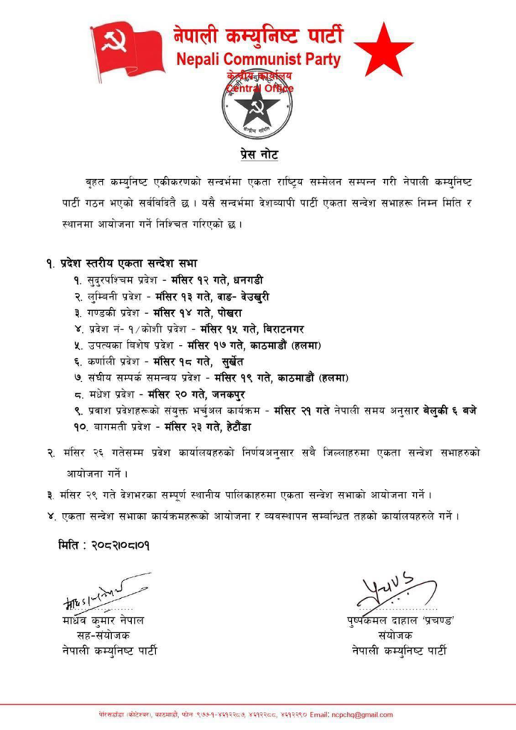 यसैगरी २३ मंसिरमा बागमती प्रदेश अन्तर्गत हेटौंडामा, २६ मंसिरमा प्रदेश कार्यालयहरूको निर्णयअनुसार सबै जिल्लाहरूमा एकता सभा आयोजना हुने नेकपाले जनाएको छ ।