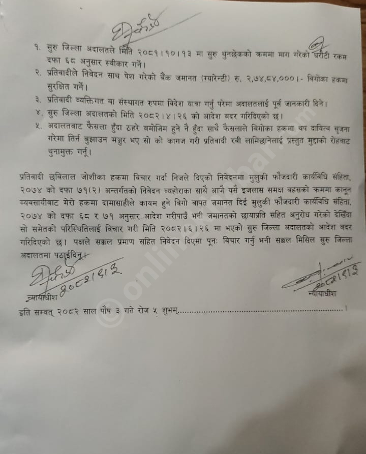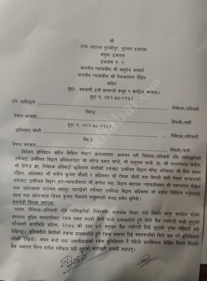 उच्च अदालत बुटवलका सूचना अधिकारी रामबहादुर कुँवरले रविलाई २ करोड ६८ लाख रुपैयाँ जमानतवापत राख्न र त्यो राखेमा थुनामुक्त गर्न आदेश दिएको हो ।