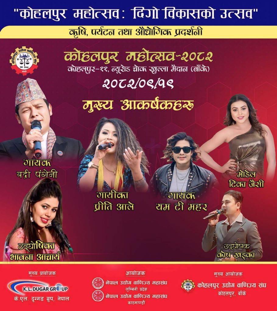 कोहलपुर महोत्सवको अवधि पाँच दिन थप गरिएको छ। महोत्सवप्रति दर्शकको उल्लेखनीय आकर्षण तथा व्यवसायीहरूको मागलाई मध्यनजर गर्दै पुष ९ गतेदेखि १८ गतेसम्म सञ्चालन हुने भनिएको महोत्सव अब पुष २५ गतेसम्म सञ्चालन हुने भएको हो।