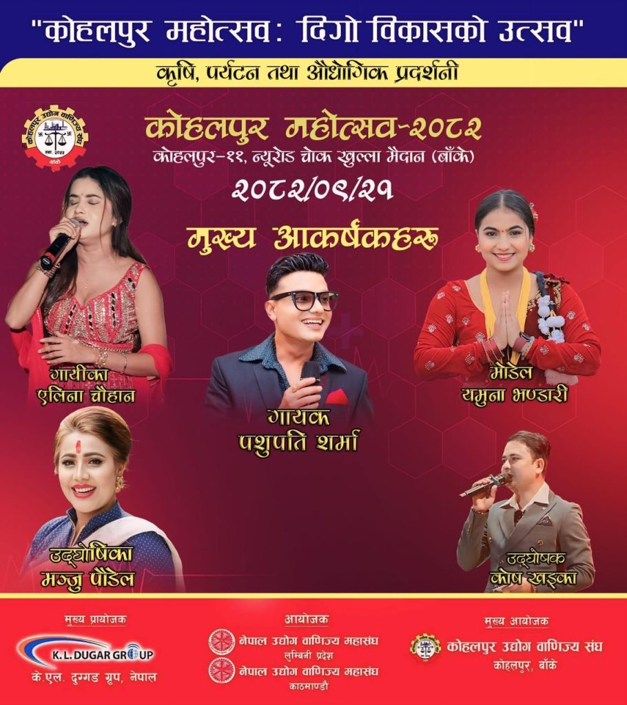 २० पुस, कोहलपुर । कोहलपुरमा जारी कोहलपुर महोत्सव–२०८२ को १२औँ दिन आइतबार चर्चित कलाकारहरूको आकर्षक प्रस्तुतीले महोत्सवस्थल उत्सवमय बनेको छ।