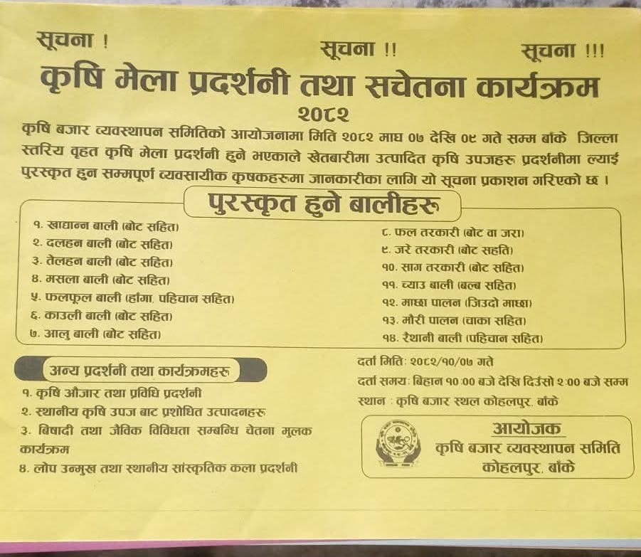 कृषि बजार व्यवस्थापन समिति कोहलपुर बाँकेको २७ औ स्थापना दिवस तथा कृषि मेला प्रदर्शनी तथा सचेतना कार्यक्रम २०८२ कोहलपुरमा सुरु भएको छ । आज देखी सुरु भएको मेला तथा सचेतना कार्यक्रम ९ गते सम्म सञ्चालन हुने कृषि बजार व्यवस्थापन समिति कोहलपुर बाँकेका अध्यक्ष उदिराम वलीले जानकारी दिए । मेलामा बिभिन्न १४ वाली लाई पुरस्कार तथा सचेतना गरिने वलीको भनाई छ ।