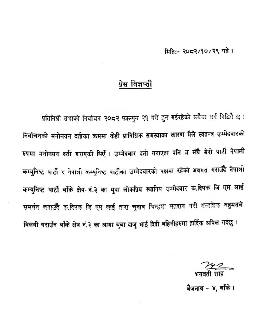 प्रेस विज्ञप्तिमा हस्ताक्षर गर्दै भगवती शाह, बैजनाथ गाउँपालिका–४, निवासी शाहको समर्थनले दिपक जि एम अझै बलियो भएर प्रस्तुत हुने स्पष्ट भएको छ। बाँके -३ ले निर्वाचन शान्तिपूर्ण, निष्पक्ष र सहभागितामूलक हुनुपर्नेमा समेत जोड दिदैं नेपाली कम्युनिस्ट पार्टी का उम्मेदवार दिपक जि एम लाई शाहले शुभकामना तथा आशिर्वाद प्रदान गर्नुभएको छ।